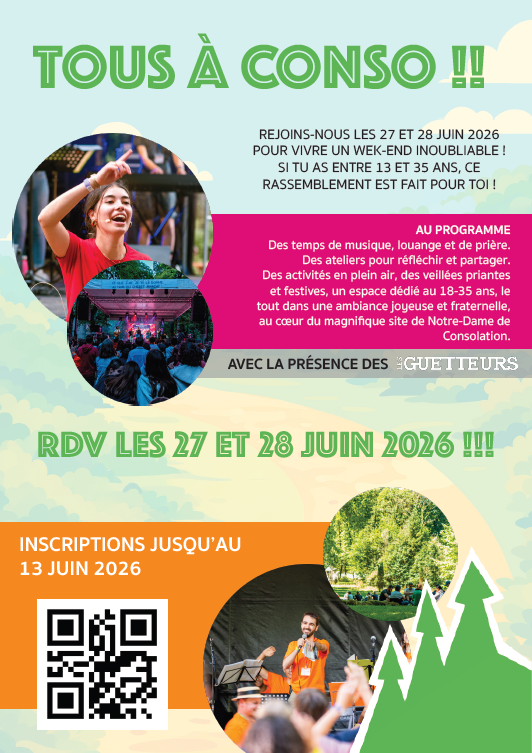 Ce week-end rassemble depuis 5 ans des centaines de jeunes autour d'un thème qui guide leur week-end. Au programme : temps fraternels, animations, témoignages, veillées, prière et célébration. Nous souhaitons vivre un moment simple et joyeux, permettant aux jeunes de se rencontrer, de prier ensemble et de grandir dans la foi. ✨