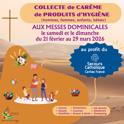 "Durant le temps de Carême, nous sommes invités à revenir à l'essentiel, à un certain dépouillement, à être solidaire en posant des gestes concrets. Cette année, nous vous proposons, durant les dimanches de Carême, de collecter des produits d'hygiène à destination du Secours Catholique. Merci pour votre générosité." Abbé Jean-Marie