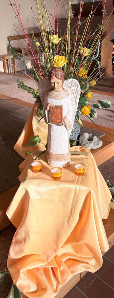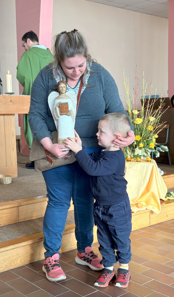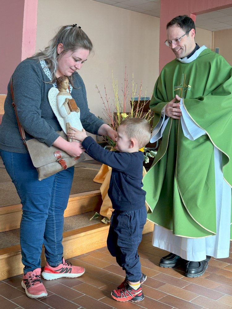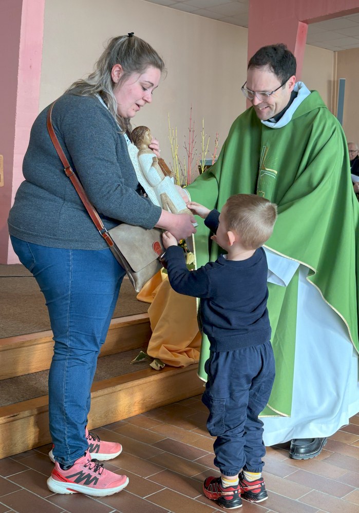 C'est au cours de la messe du dimanche 2 mars, en l'église Saint-Joseph, que l'abbé Franck Ruffiot a transmis la statue du saint Ange à la famille de Gwenaëlle, Arnaud et leur fils Gabriel.