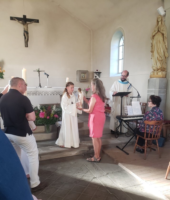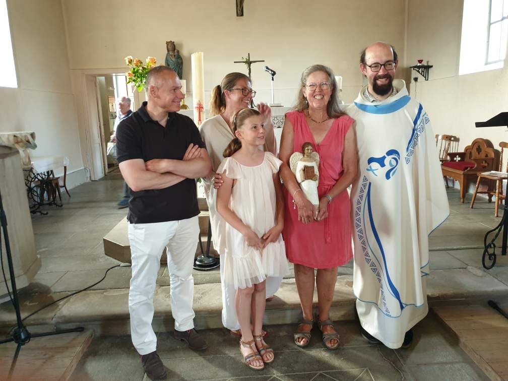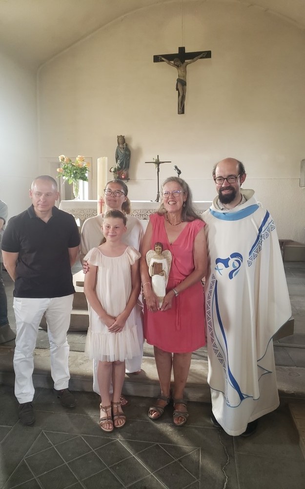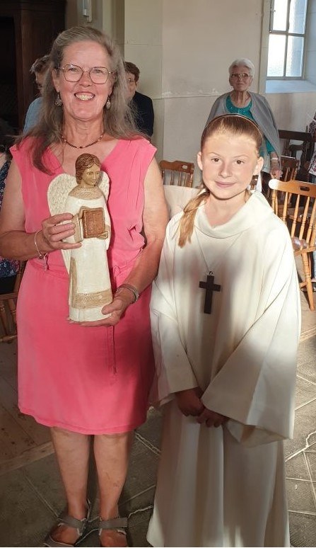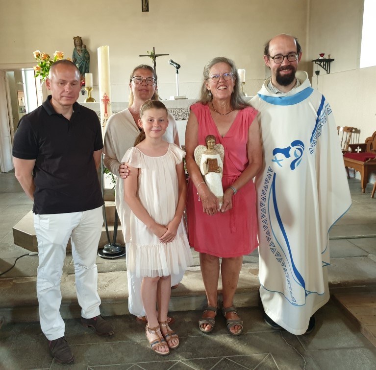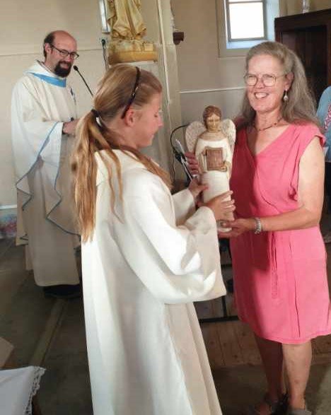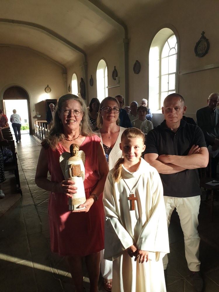 En l'église de Mailleroncourt, ce samedi 31 mai, en fin de célébration dominicale présidée par l'abbé Jean-Marie, Livia a remis la statue du saint-Ange à la famille de Véronique LAMBOLEY (©Christophe R. et Pascale D.)