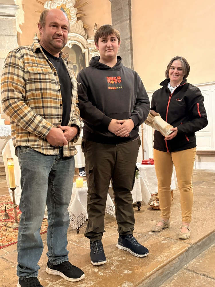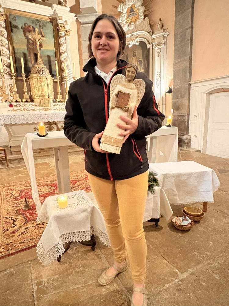 À la fin de la messe célébrée en l'église Saint-Christophe de Rioz, la statue du Saint-Ange a été transmise par Jérémy et Christophe à Gaëlle MUHLMATTER de Mollans.
