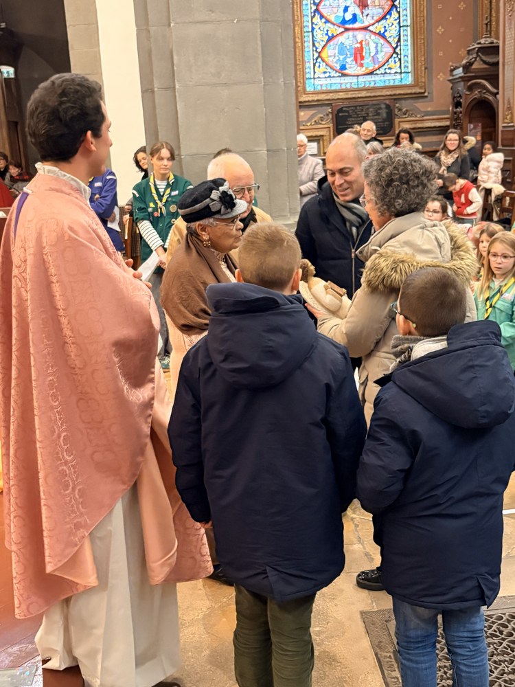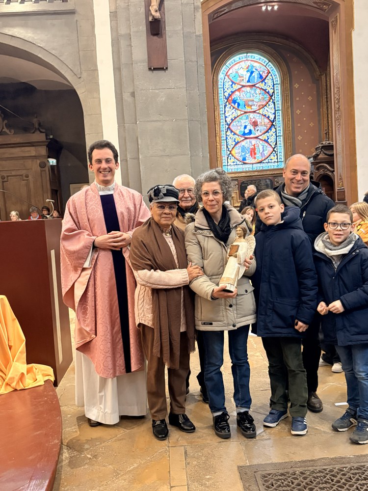 C'est à la fin de la messe présidée par l'abbé Emmanuel que Henriette et Bernard ont transmis le saint Ange à Hélène et François Mercier accompagnés de leurs deux garçons.