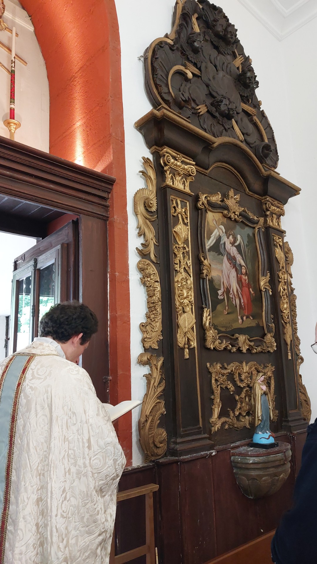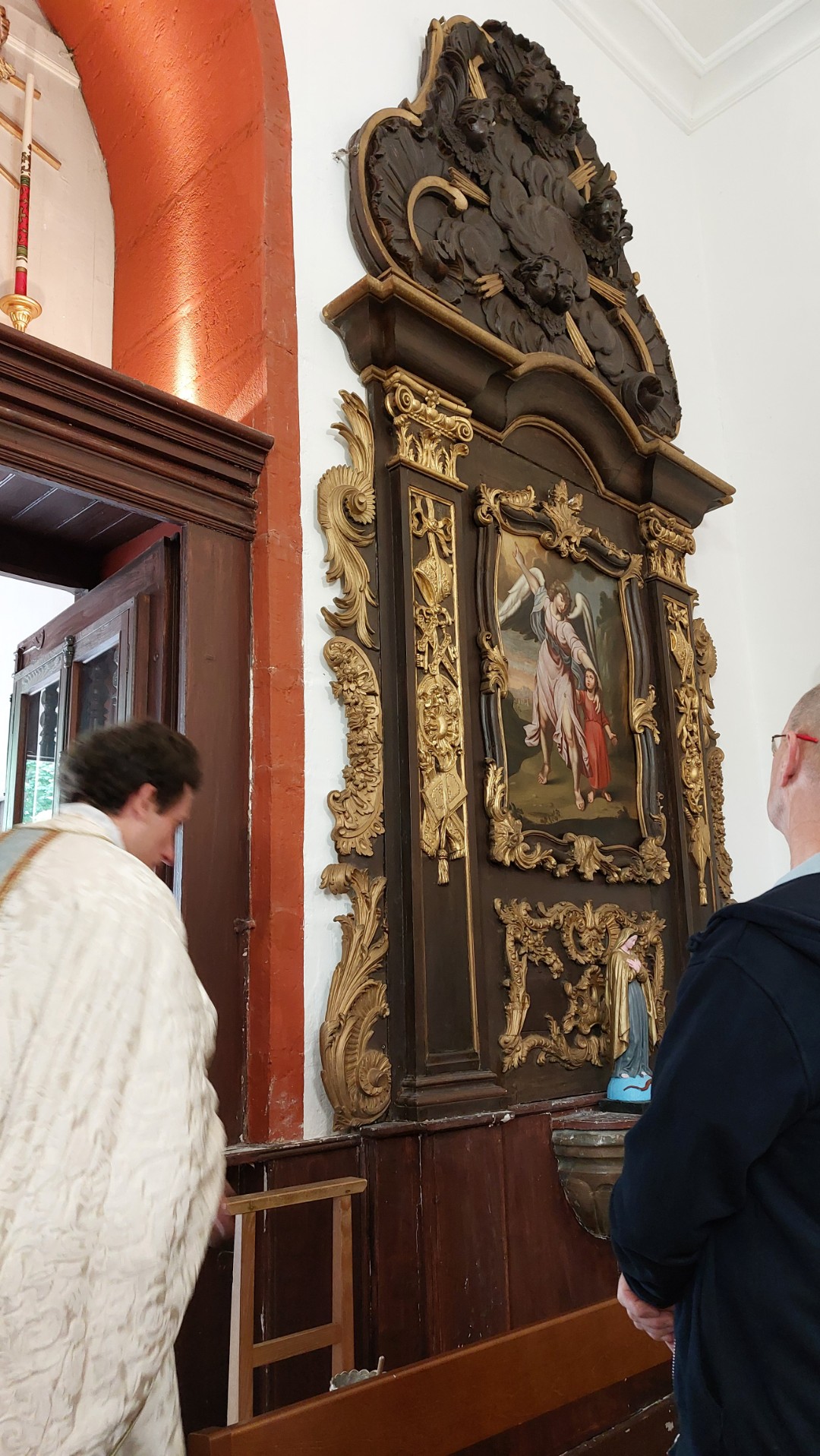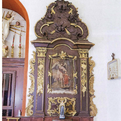 Le retable de l'Ange gardien date du XVIIIè siècle ; il est situé dans la nef de l'église Notre-Dame de l'Assomption, sur le mur du fond à gauche de la porte d'entrée. Il est placé près des fonds baptismaux. (© Henriette T.)