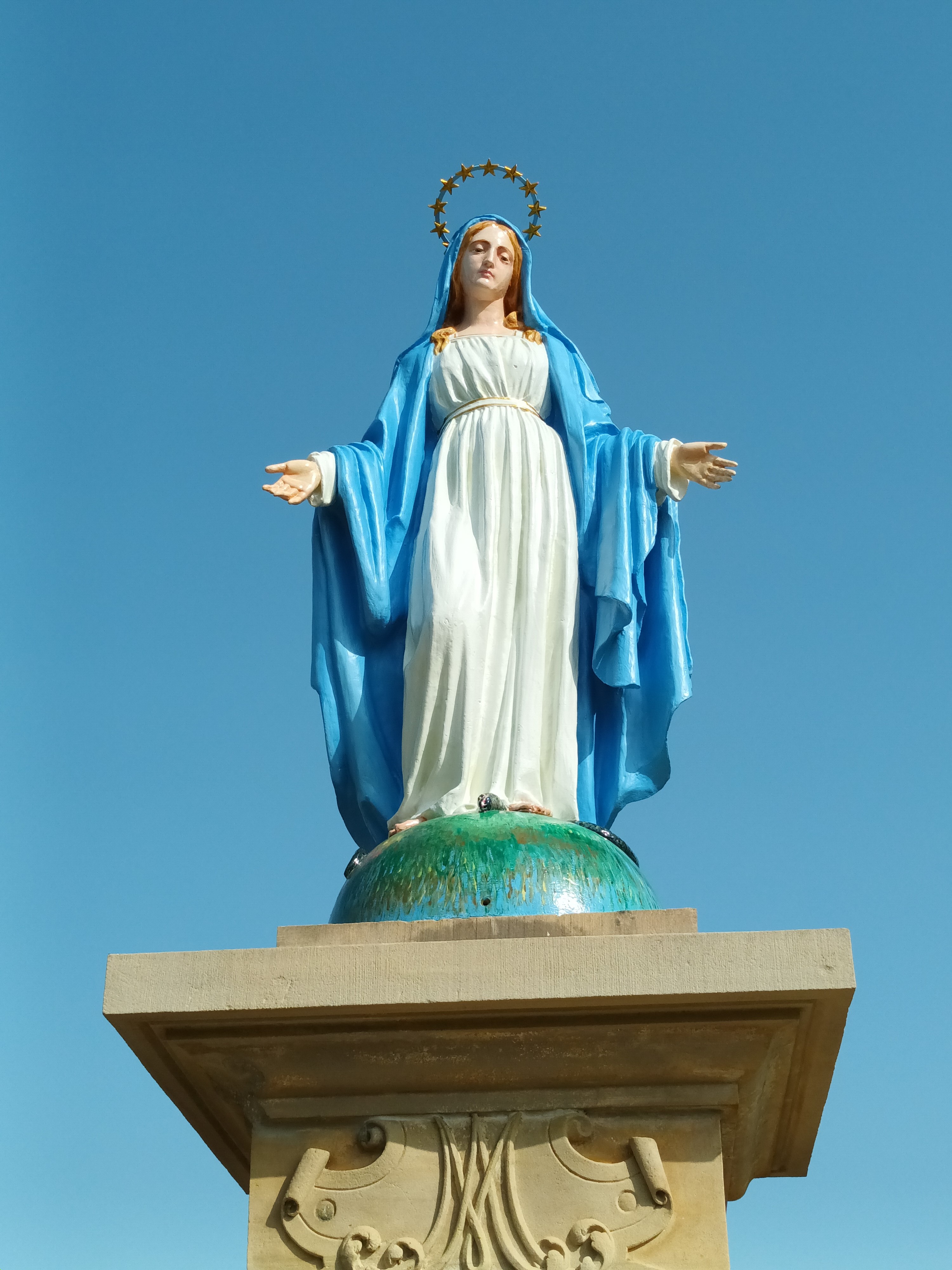 Marie-Luce, qui a étudié aux Beaux-arts de Nancy en section Arts, aura passé 6 jours dans son atelier improvisé pour affiner le travail de peinture. Le globe terrestre sur lequel se tient la Vierge, au départ figuratif, a fait place progressivement à une représentation abstraite de la nature et des 4 éléments : l’air, la terre, l’eau et le feu.