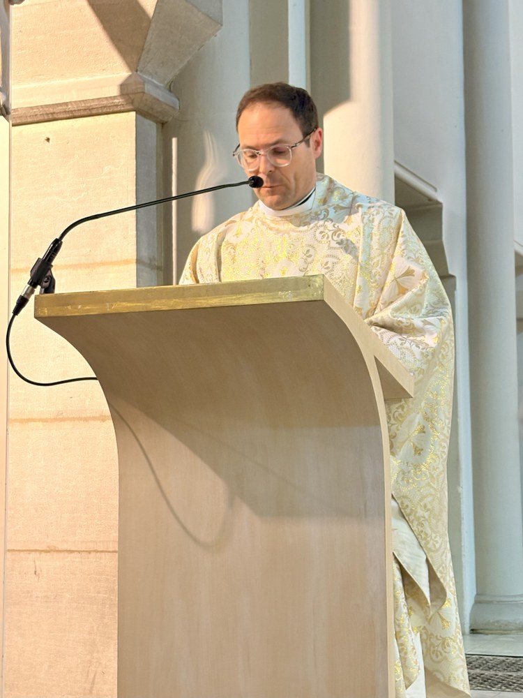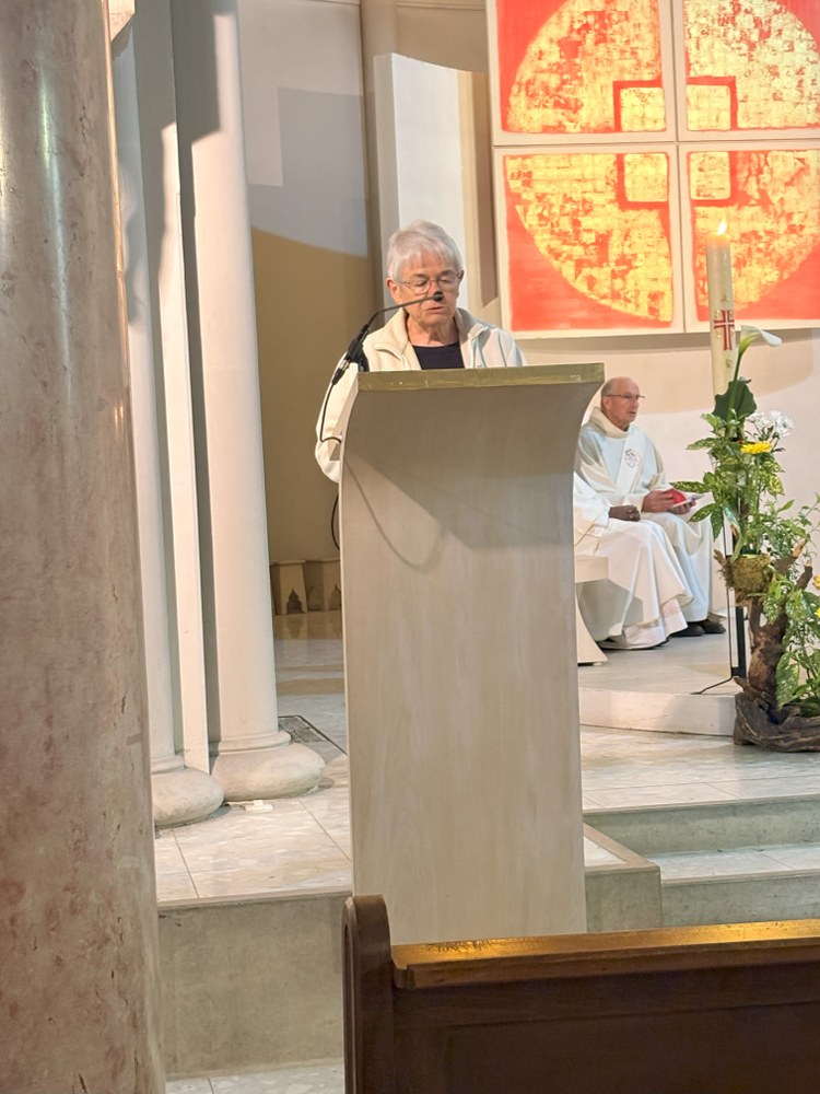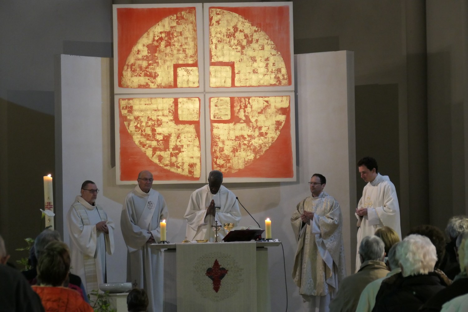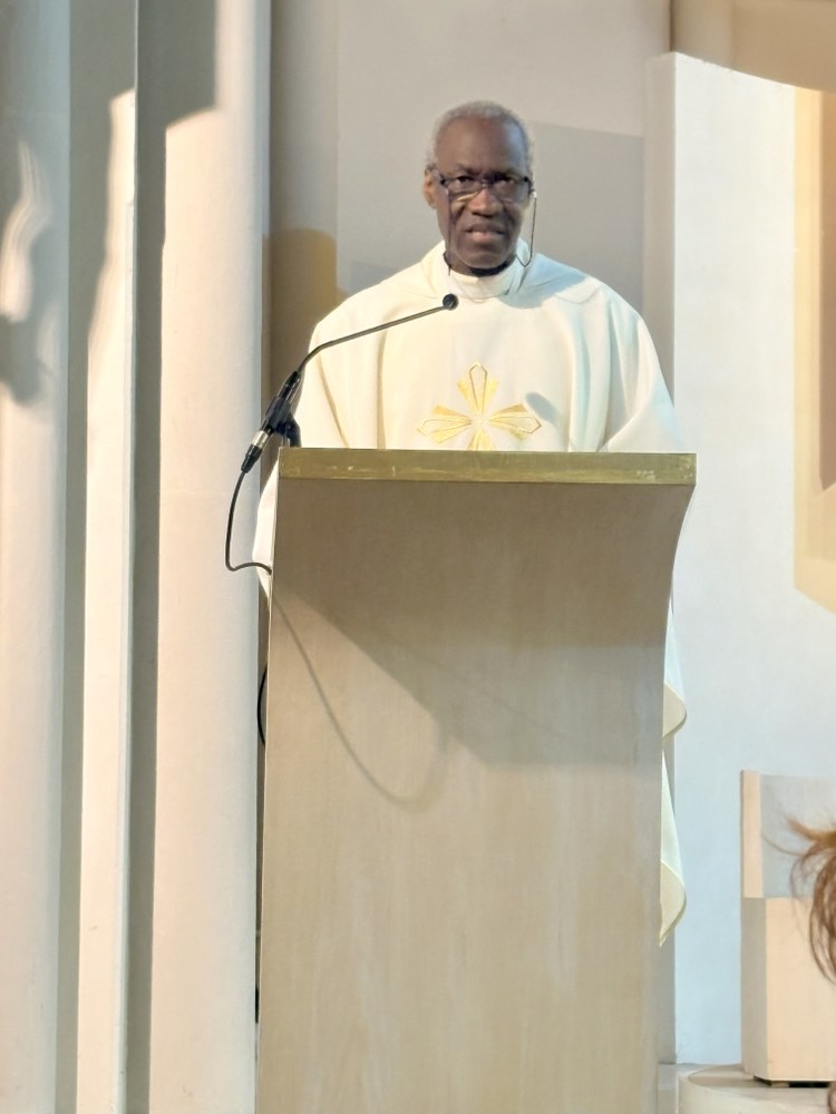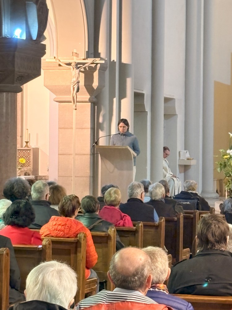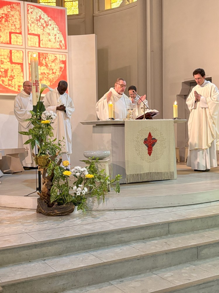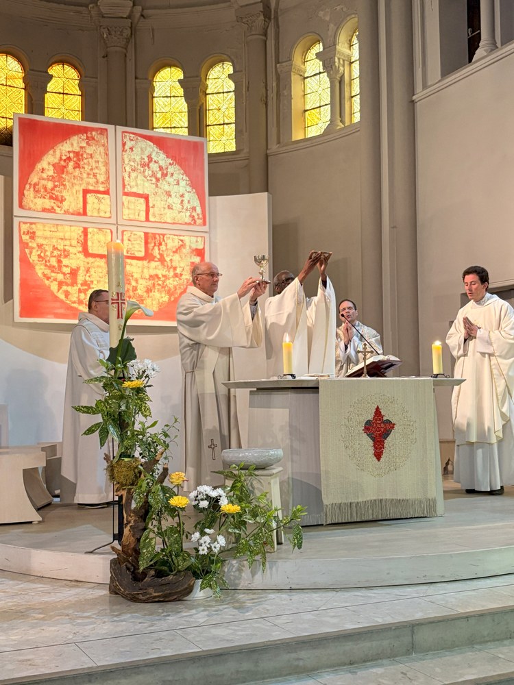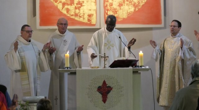 Belle participation des fidèles du doyenné à la messe célébrée en hommage au Pape François, décédé le 21 avril. L'office était présidé par l'abbé Jean-Bosco Dao, concélébré par les abbés Franck Ruffiot, Jacques Eblin et Emmanuel Barsu et assistés du diacre André Brunner.