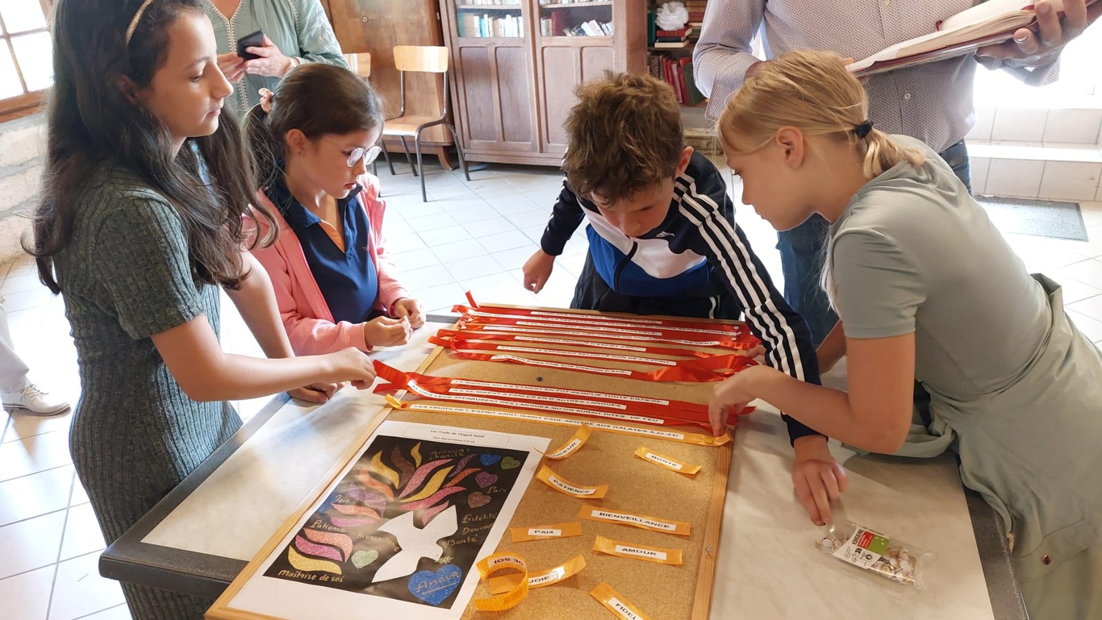 Leurs catéchistes, aidés de jeunes confirmés, avaient balisé le parcours avec des symboles de l’Esprit Saint à retrouver pour les orienter vers des rubans de couleur rouge ou orange cachés en différents endroits . 2 groupes ont été constitués. Le premier devait retrouver les rubans de couleur rouge constituant une partie du texte des Actes des Apôtres( AC 2,1-11) ; le deuxième groupe recherchait les rubans orange qui devaient leur permettre de retrouver les fruits de l’Esprit Saint évoqués dans le texte des Galates( 5,22-23).