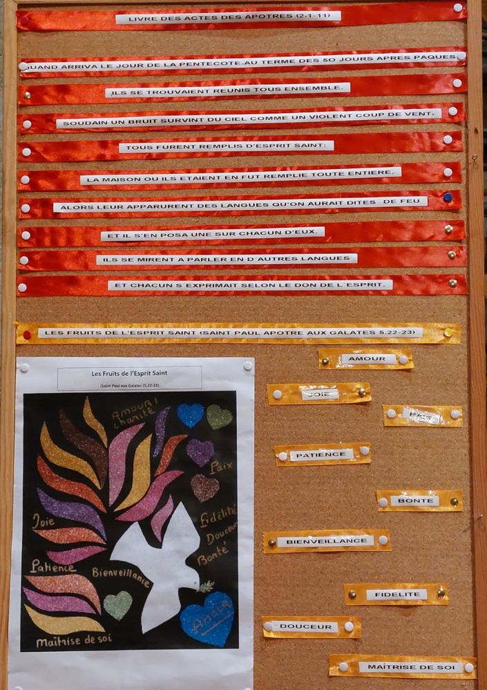 Un tableau récapitulait le travail fourni par les jeunes ( un visuel sur l’Esprit Saint accompagné du texte reconstitué par les rubans rouges et les rubans orange produisant les fruits.)