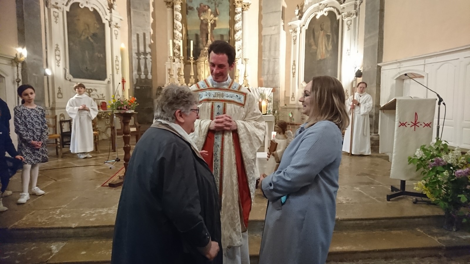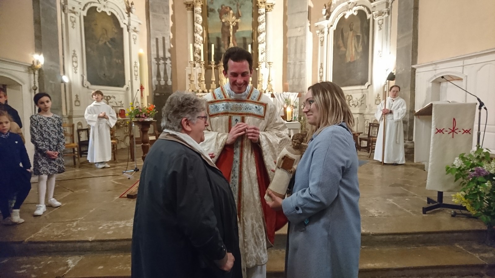 En l'église Saint-Christophe de Rioz, ce dimanche 20 avril - Jour de Pâques - l'abbé Emmanuel Barsu a transmis le saint Ange à Madame Emma GINOUVES. ©photos : David D.