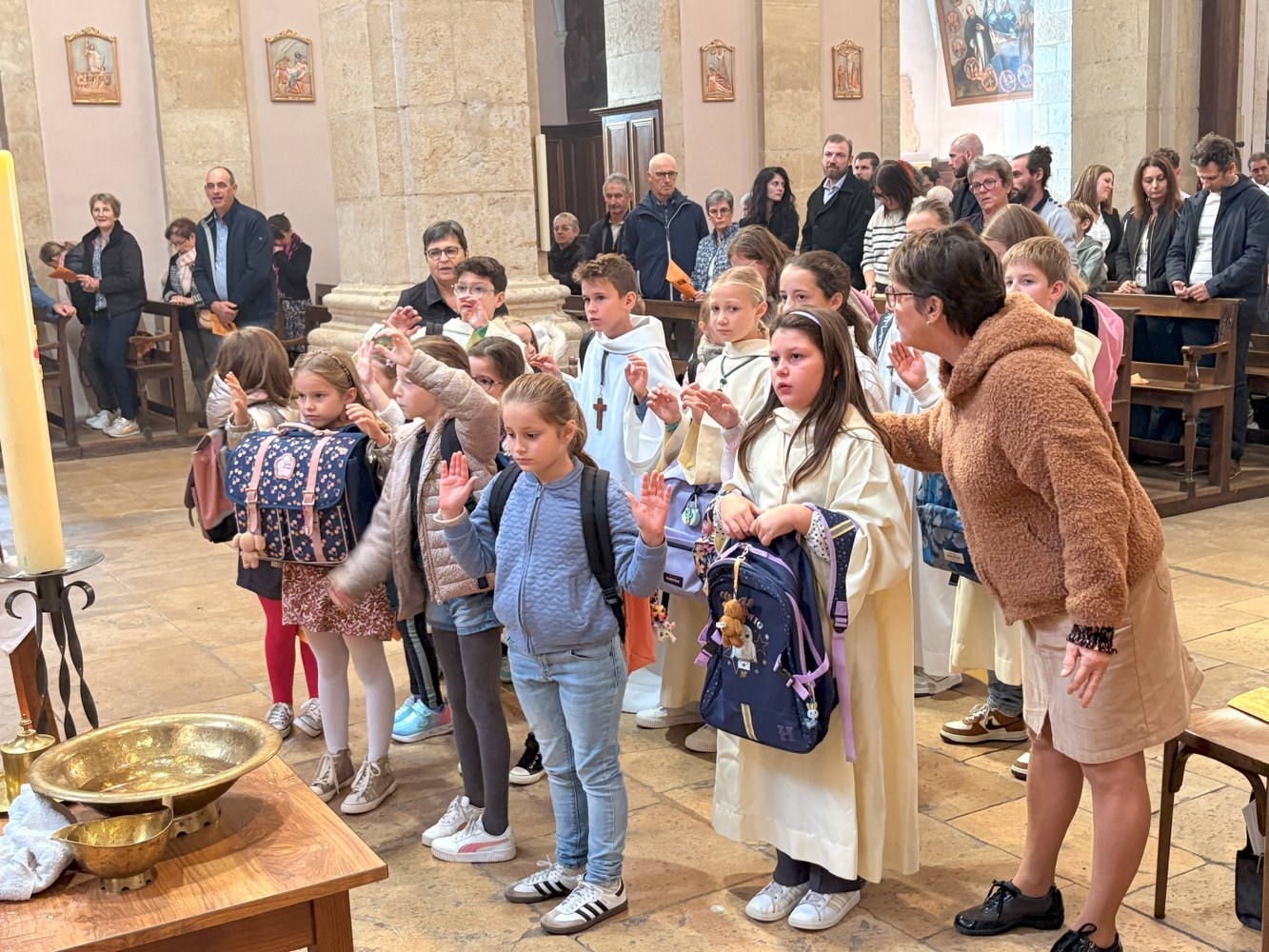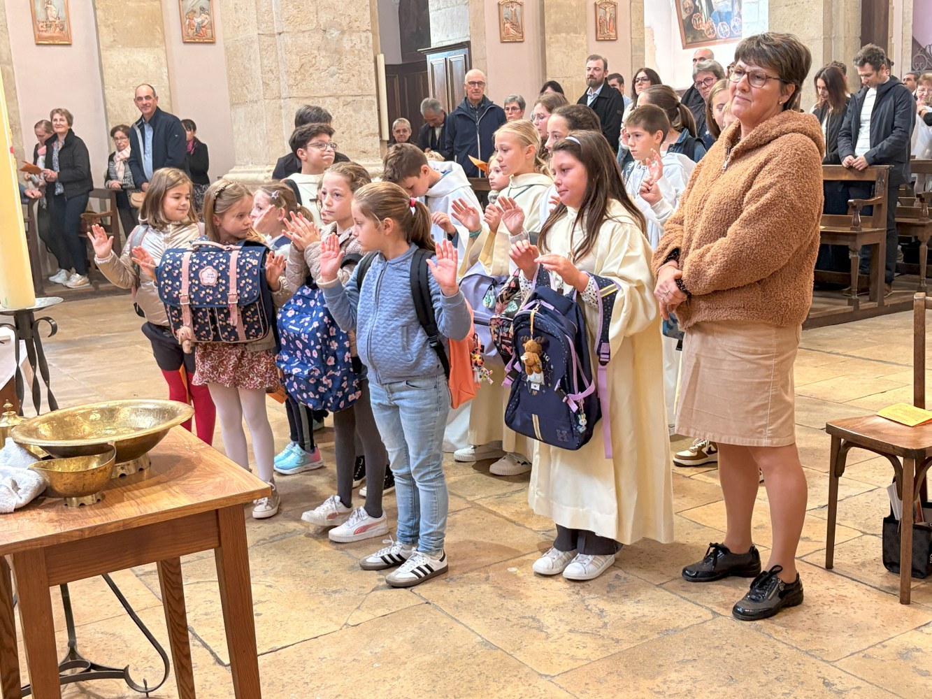 Avant la bénédiction solennelle et le chant d'envoi, l'abbé a béni les cartables des enfants.