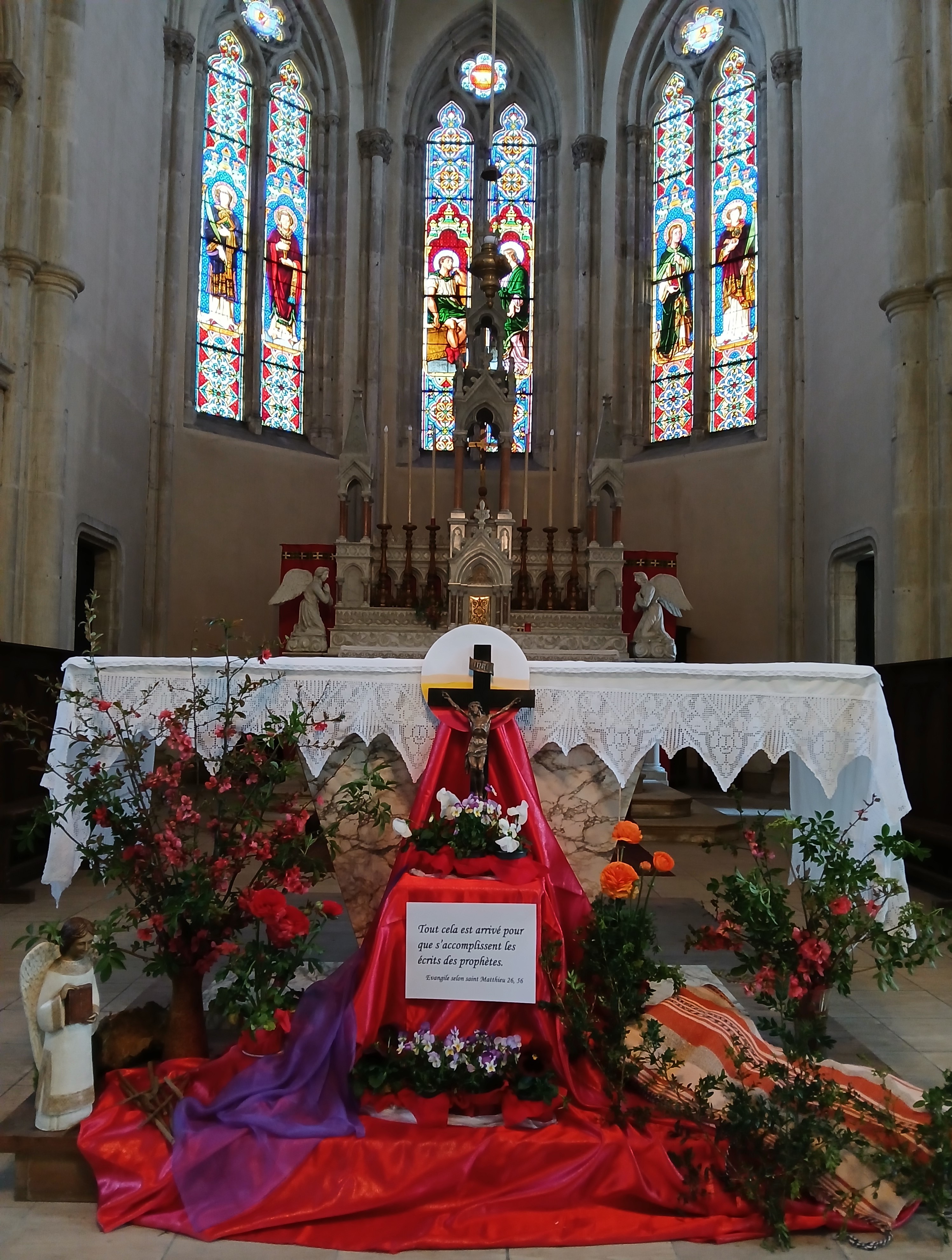 « tour des églises » dans une ville de la Côte d’Azur, toutes parées des plus magnifiques reposoirs pour le Jeudi Saint ; la joie et l’honneur de donner la communion lors de la messe, de déposer le Corps du Christ avec un infini respect dans ces mains qui disent la vie du monde, son activité et ses épreuves.L’émotion saisit une patiente lorsqu’elle évoque des membres de sa famille morts à cause de la guerre : « Si c’est possible de faire ça à une mère, à une sœur ! » Sous les bras étendus du Fils, nous nous unissons à la Vierge Marie, Mère des Douleurs, debout dans la foi, présente à nos propres croix. Une patiente abonnée à Ressources, le magazine diocésain de la pastorale de la santé, en lit spontanément le Notre Père commenté, qui résonne si bien avec l’actualité.