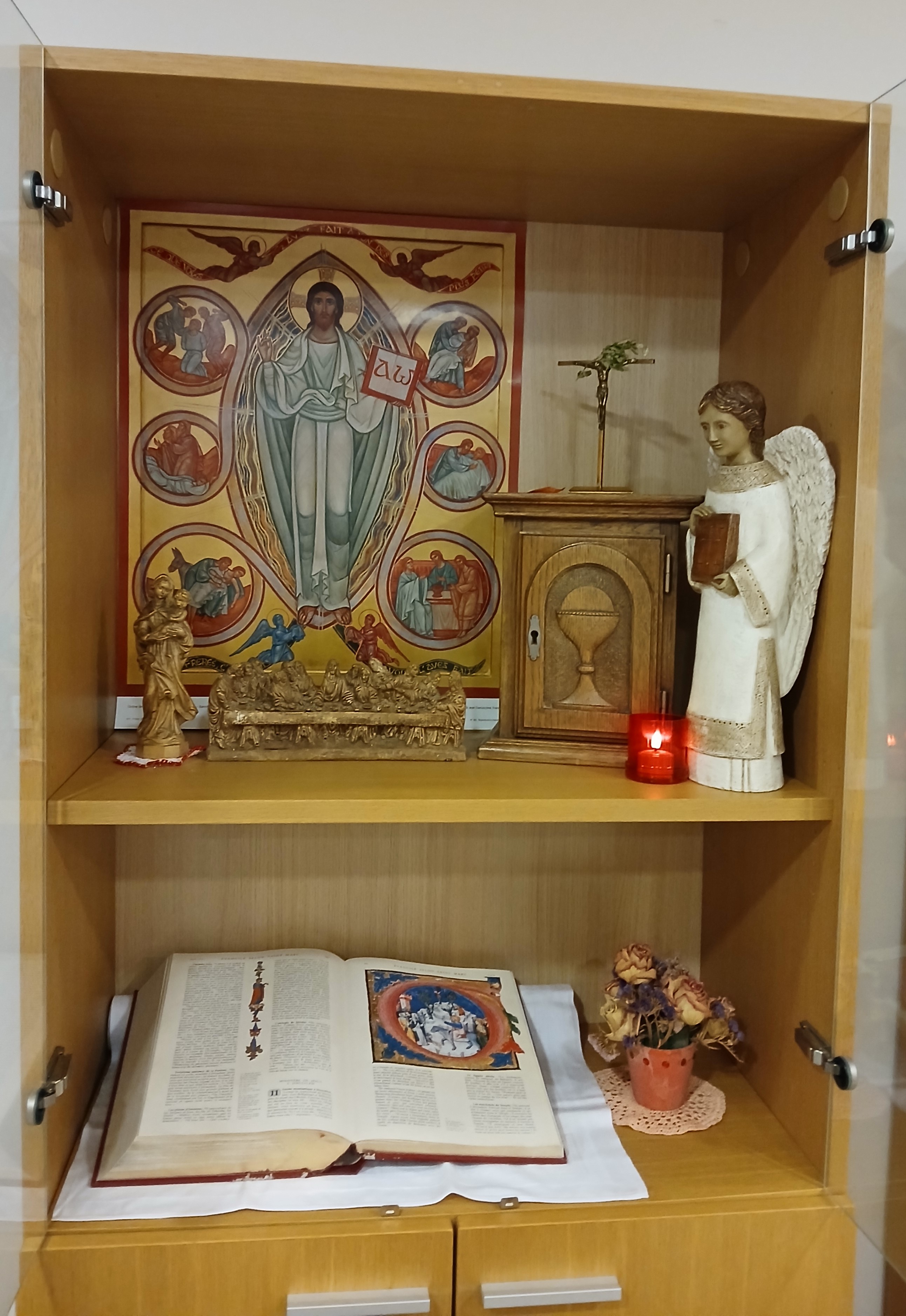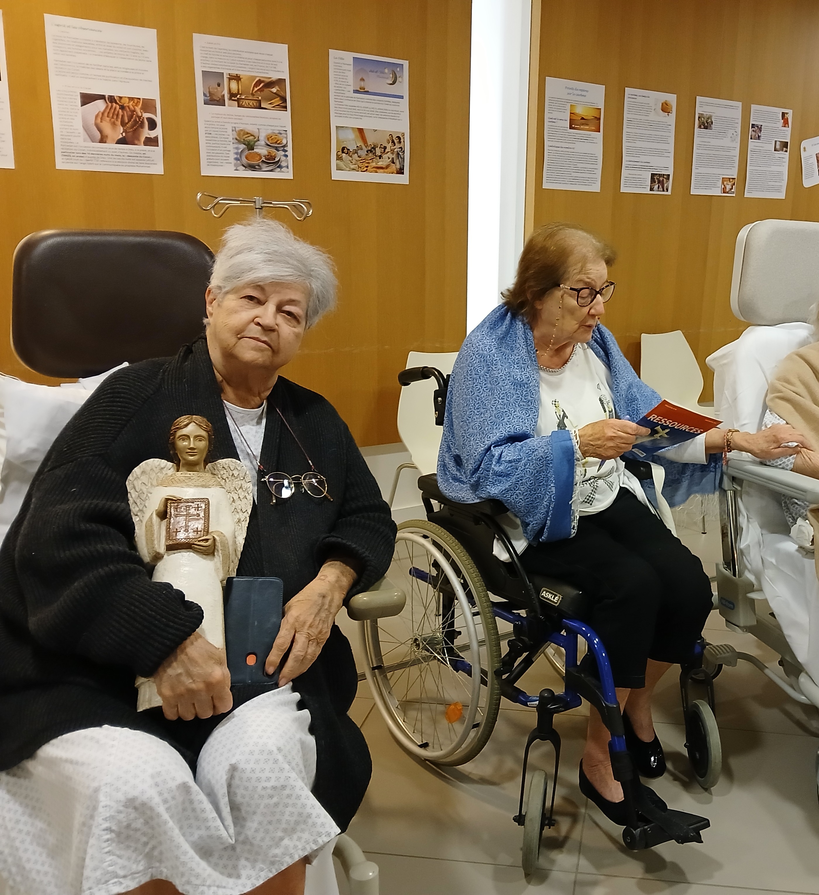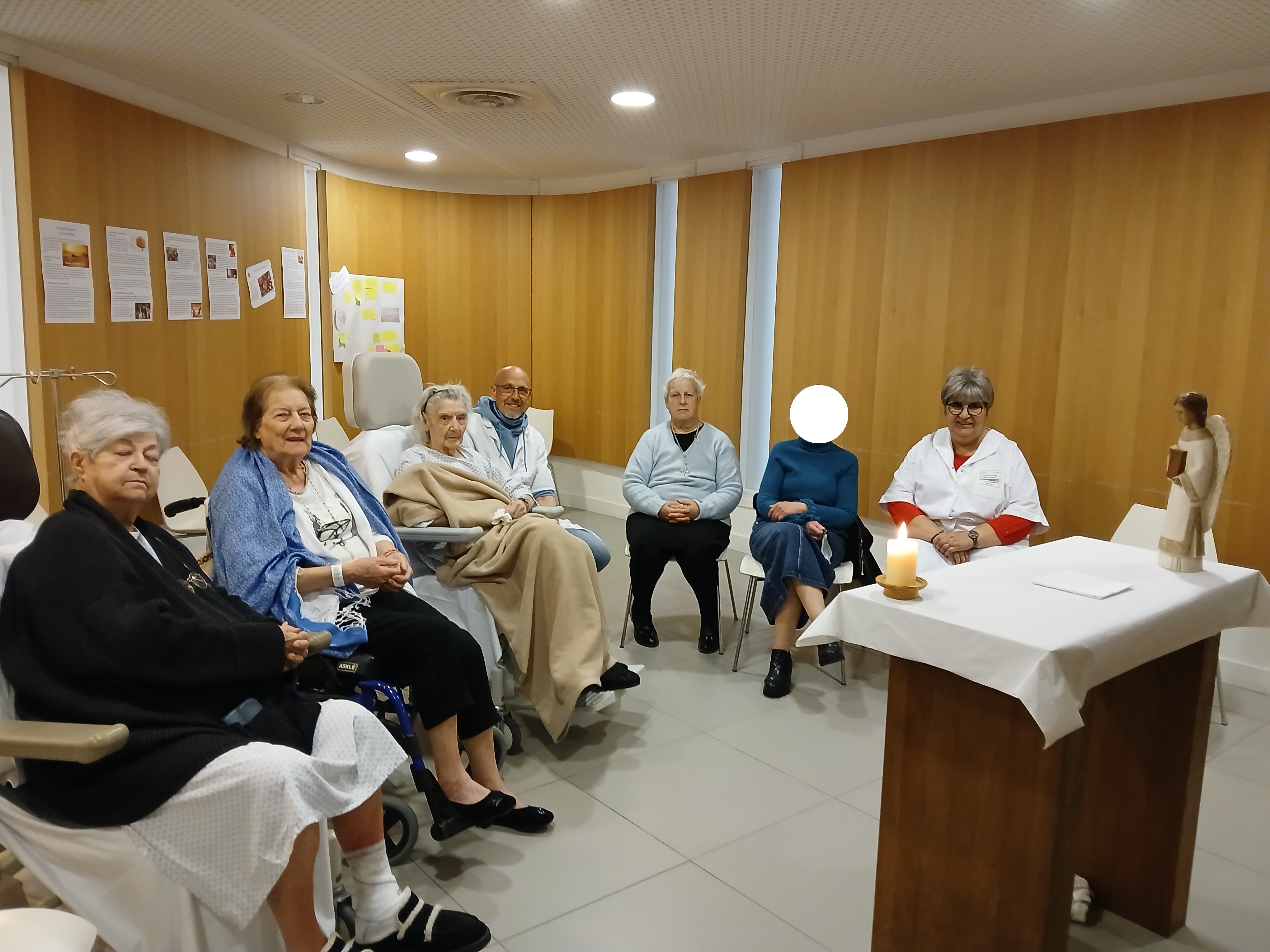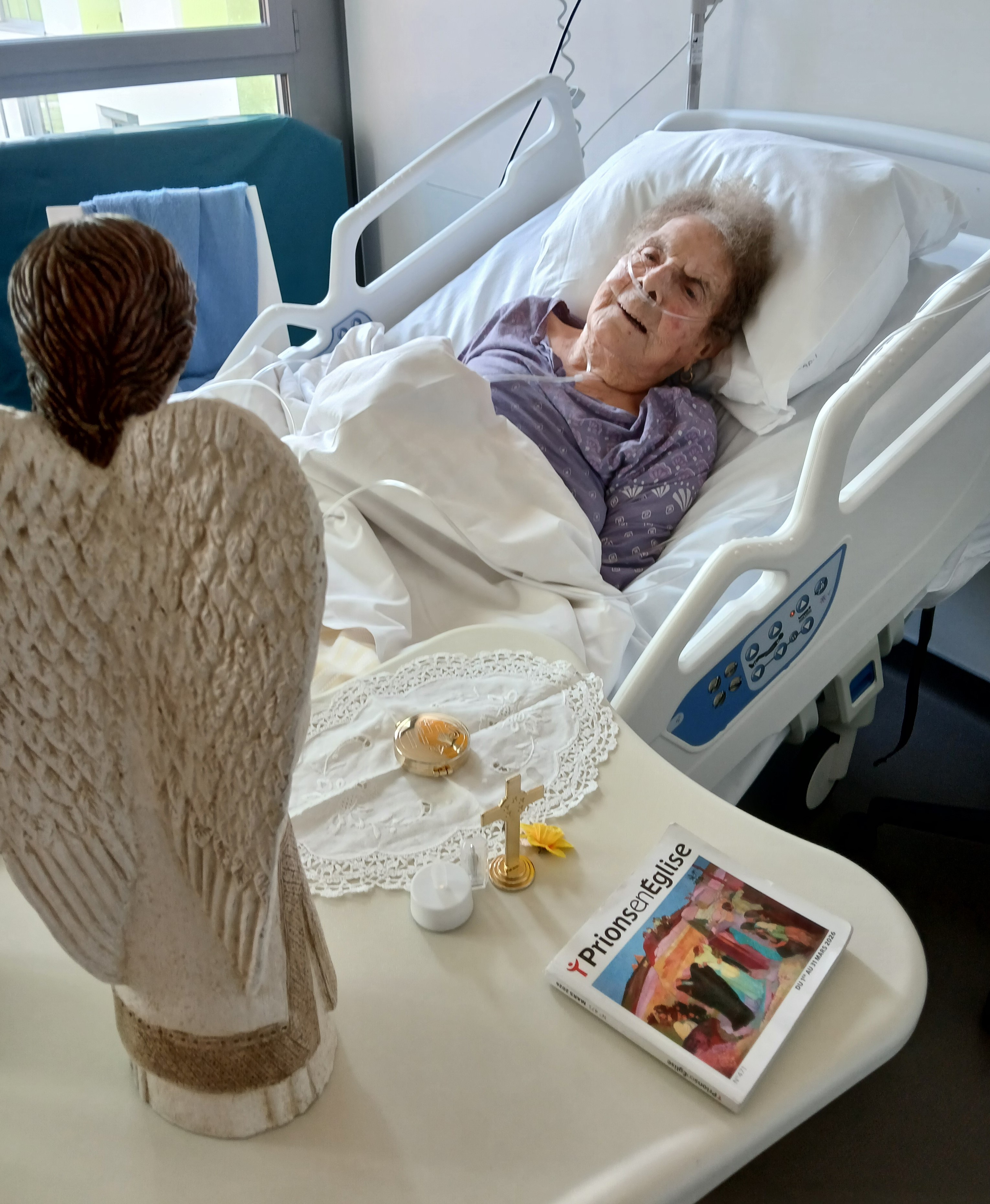 Après la communion donnée aux patientes, l’ange voyage de bras en bras. Chacun lui confie à voix haute ou dans son cœur ses intentions pour qu’il les porte au Seigneur. Dans ce lieu de souffrance et de soins, l’espérance guide nos pas sur le chemin. La joie de Pâques n’était pas loin.