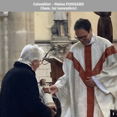 À la fin de la messe de Toussaint, en l'église des Saints-Jumeaux (Méleusippe, Speusippe et Éleusippe) de Colombier, l'abbé Franck Ruffiot a remis la statue du Saint-Ange à Marie-Louise Foissard de Colombier. (© Christine G.)