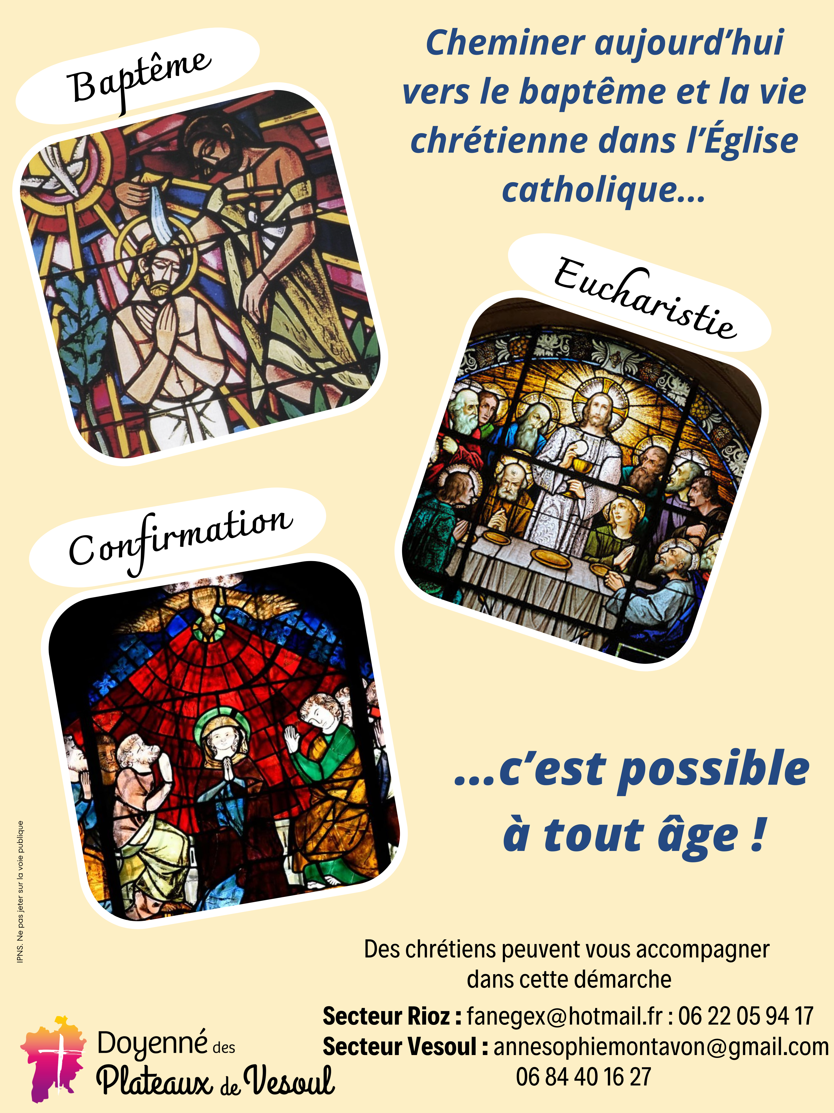 Chaque année des adultes, hommes et femmes, se mettent en route pour devenir chrétien. Ils sont accompagnés par d’autres chrétiens, des « aînés dans la foi », et vont découvrir peu à peu ce Dieu qu’ils cherchent, découvrir Jésus le Christ, apprendre à vivre avec lui en priant et en mettant en pratique son Évangile. Par étapes ils marcheront vers le Baptême, la Confirmation et l’Eucharistie, les sacrements de l’initiation chrétienne, et ainsi ils se lanceront dans l’aventure qu’est la vie chrétienne.