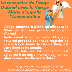 L'évangile selon saint Matthieu (Mt 1, 18-24) nous relate l’apparition de l'Ange du Seigneur à Joseph afin de lui expliquer le projet de Dieu et surtout qu’il ne craigne pas de prendre chez lui Marie, son épouse. Car, l’enfant qu’elle porte en elle vient de l’Esprit Saint.