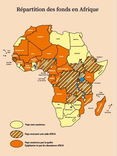 Les sommes récoltées des diocèses français sont redistribuées à des diocèses africains (essentiellement francophones, mais aussi anglophones et lusophones) pour les besoins de leurs églises. Cette collecte de l’Épiphanie vient en complément de l’aide apportée par les Œuvres Pontificales Missionnaires (OPM). Elle permet de soutenir des projets relativement modestes pour la formation des laïcs, des catéchistes et la croissance de petites communautés implantées parmi les paysans, les pauvres des villes et les populations abandonnées.