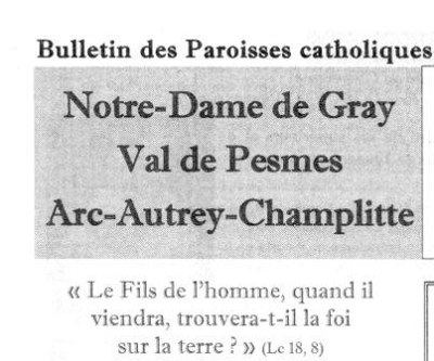 Publié le 19/12/2019Le bulletin n° 32, Décembre 2019, des trois paroisses catholiques, Notre-Dame de Gray, Val de Pesmes et Arc-Autrey-Champlitte vient de paraître.