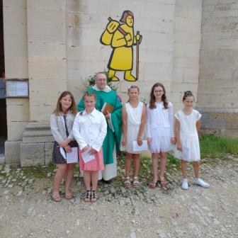 Cinq enfants de notre paroisse ont communié pour la première fois le 20 juin 2021 à Champlitte lors de la messe célébrée par le frère Serge, prêtre au service des paroisses de la plaine de Gray. Ces enfants ont suivi leurs séances de caté toutes les semaines en visio car la situation sanitaire a empêché des séances en présentiel. Leurs catéchistes, Hélène Bergelin et Chantal Guinet, ainsi que leurs proches, étaient heureux et émus de les accompagner lors de cette étape fondamentale dans leur vie chrétienne.