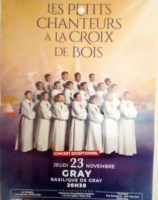 Concert des petits chanteurs à la croix de bois Quand le 23/11/2023 de 20h30 à 22h00 Où Basilique de Gray Ajouter l'événement au calendrier vCal iCal