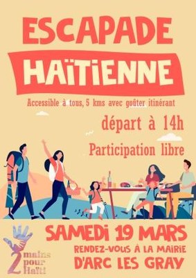L'association Deux Mains pour Haïti, qui parraine la scolarité de 26 enfants en Haïti, a organisé une marche gourmande d'environ 5-6 kilomètres dans les hauteurs d'Arc-lès-Gray. La marche, ponctuée de pauses gourmandes et d'initiation à la langue créole, était suivie d'un goûter à la mairie d'Arc-lès-Gray. L'Assemblée Générale de l'association s'est tenue dans la foulée. Voir les photos
