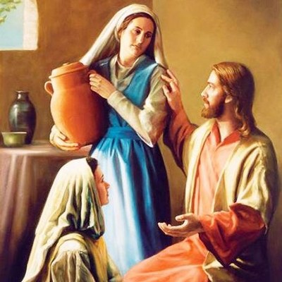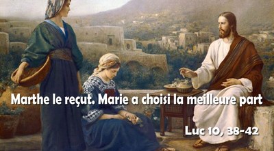 Jésus entre dans un village, qu’on sait être celui de Béthanie, où habitent ses amis Lazare, Marthe et Marie (cf. Jn 11). Marthe, qui est sans doute l’aînée, va à sa rencontre et lui offre l’hospitalité. C’est elle qui, comme Sara jadis avec les trois voyageurs, se charge du repas. Sa jeune sœur Marie est assise aux pieds de Jésus et ne se préoccupe que d’écouter la parole du Maître. Quant à Marthe, elle est « accaparée » par les préparatifs du repas, et aimerait bien que Jésus intervienne pour que Marie fasse sa part du service. Or Jésus s’adresse plutôt à Marthe et la ramène à l’essentiel, cette « meilleure part » choisie par Marie. Il n’y a pas meilleur repas que celui offert par Jésus, Parole incarnée du Dieu vivant.