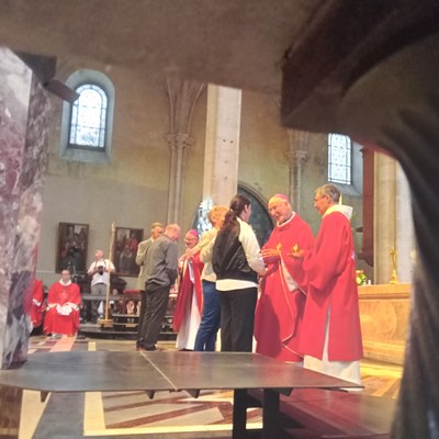 Ils sont tous les deux auprès des évêques qui les confirment : lui, François Weirauch à gauche, Sylvie Varey à droite.