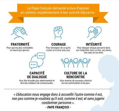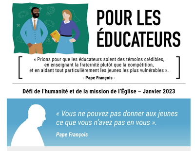 « Je voudrais proposer aux éducateurs d’ajouter un nouveau contenu à leur enseignement : la fraternité. L’éducation est un acte d’amour qui éclaire le chemin afin que nous retrouvions le sens de la fraternité et que les plus vulnérables ne soient pas ignorés. L’éducateur est un témoin qui ne transmet pas ses connaissances mentales, mais ses convictions et son engagement dans la vie. C’est celui qui sait bien manier les trois langues : la langue de la tête, du cœur et des mains, en harmonie. Et donc la joie de communiquer. C’est ce genre d’éducateur qui sera écouté avec beaucoup plus d’attention et qui sera en mesure de créer une communauté. Pourquoi ? Parce qu’il sème ce témoignage. Prions pour que les éducateurs soient des témoins crédibles, en enseignant la fraternité plutôt que la compétition, et en aidant tout particulièrement les jeunes les plus vulnérables ». (Pape François)
