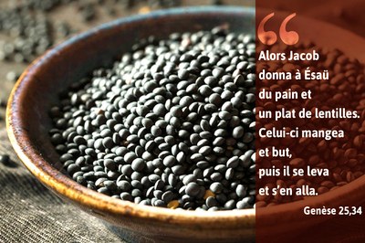 Un jour, Jacob préparait un plat, quand Ésaü revint des champs, épuisé. Ésaü dit à Jacob : « Laisse-moi donc avaler cette sauce, le roux qui est là, car je suis épuisé ! » […] Jacob lui dit : « Vends-moi maintenant ton droit d’aînesse ! ». Ésaü répondit : « Je suis en train de mourir ! À quoi bon mon droit d’aînesse ? » Jacob reprit : « Jure-le moi, maintenant ! » Et Ésaü le jura, il vendit son droit d’aînesse à Jacob. Alors Jacob donna à Ésaü du pain et un plat de lentilles. Celui-ci mangea et but, puis il se leva et s’en alla. C’est ainsi qu’Ésaü montra du mépris pour le droit d’aînesse. (Gn 25, 29-34)