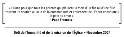 Dans son intention de prière du mois de novembre, le Pape nous invite à prier pour que « tous les parents qui pleurent la mort d’un fils ou d’une fille trouvent un soutien au sein de la communauté et obtiennent de l’Esprit consolateur la paix du cœur ».