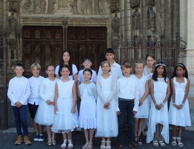 Soline AUBRY, Cléophas BRYON, Julian COLLINET, Léopoldine DELAMOTTE, Anaé DELAS FELICITE, Enéa DELAS FELICITE, Constant GRANCHAM, Hugo LALIGANT, Léna LALIGANT GOMES, Cloé MARCAIRE, Flavie MOREL, Luana PINHEIRO, Lucie REVOY ont fait leur communion le dimanche 22 juin à la basilique Notre-Dame de Gray, avant de se rendre en procession dans la cour du lycée Sainte-Marie