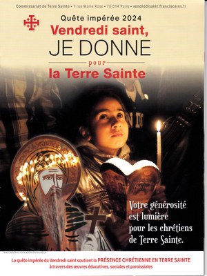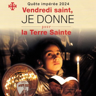 Vendredi 29 mars 2024, au jour du Vendredi Saint, quête impérée 2024 pour la Terre Sainte. « Votre générosité est lumière pour les chrétiens de Terre Sainte. »