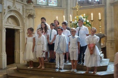 Dimanche 3 juin, jour de fête du Saint Sacrement du Corps et du Sang du Christ, 9 enfants de la Paroisse de Gray ont reçu, pour la 1ère fois, le sacrement de l'eucharistie.