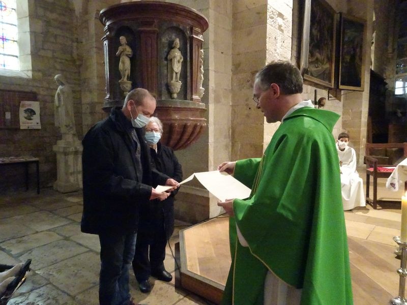Dimanche 7 Février, le Père Pierre Bergier, notre prêtre, a remis le credo et le Notre Père au catéchumène, Franck Violet en présence de Carole Tissot qui l'accompagné durant une année sur le chemin de son baptême qui aura lieu au cours de la veillée pascale le samedi 3 avril.