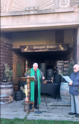 Moment émouvant avant un petit mot du brasseur autour d'une bouteille de bière bénie.