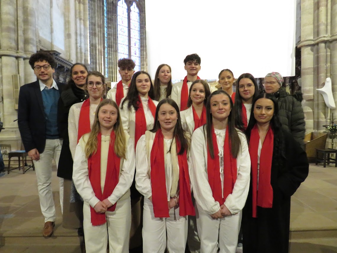 Toujours accompagnés de leurs parrains/marraines, les jeunes reçoivent une écharpe rouge en rejoignant leur place dans la nef.
