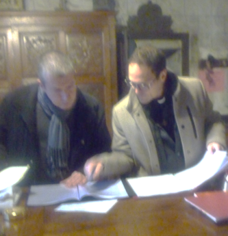 Hubert qui jouera des morceaux d’orgues. Bruno et son frère Vincent achèvent de régler la vidéo-projection des cantiques sur un grand écran.