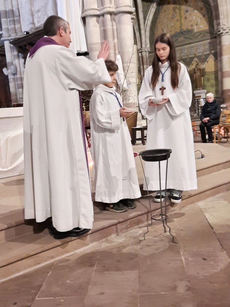 Préparée avec soin par les catéchistes, la célébration a permis à chacun d’entrer simplement et joyeusement dans ce temps important. Dans son homélie, l’abbé Jean‑François a expliqué aux enfants, avec des mots adaptés, les trois piliers du Carême : le partage, la prière et le jeûne.