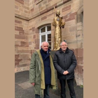 L’abbé Bernard Garret, vice-président de l’association des anciens élèves et amis de l’école St Colomban, attire l’attention sur le livre tenu par Colomban dans sa main gauche : « Débarquant à Luxeuil, vers 590, les missionnaires irlandais ont apporté avec eux des parchemins et relancer une vie culturelle éteinte par les invasions barbares.