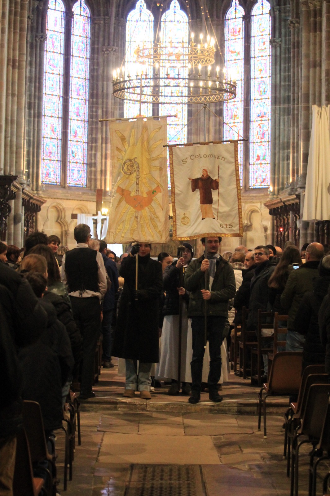 A l’issue de la messe, une procession s’ébranle derrière 2 bannières de Colomban. Au son d’une cornemuse, elle remonte la rue Victor Genoux, traverse la place du Général de Gaulle et se resserre dans la cour du collège, pour tenter de tempérer un froid glacial. En tête du cortège, porteurs des lettres appropriées, des élèves ont arboré fièrement le nom de notre saint patron, avant de se regrouper sur le podium prévu pour les prises de paroles officielles de l’inauguration de leur ensemble scolaire.