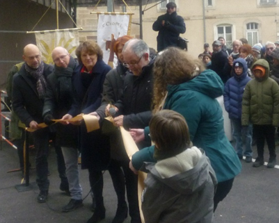 Monseigneur Jean-Luc Bouilleret coupe symboliquement le ruban tendu devant l’entrée du portail. A proximité, une nouvelle statue de Colomban est dévoilée.