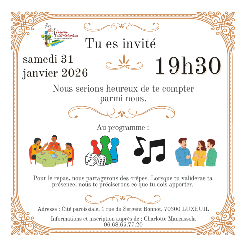Première rencontre : le samedi 31 janvier à 19h30 à la cité paroissiale de Luxeuil