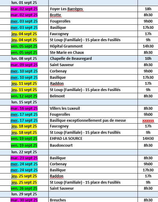 ►Un tableau des lieux et horaires des messes de semaine est publié chaque mois. Si toutefois le prêtre est indisponible la messe sera remplacée par un temps de prière.
