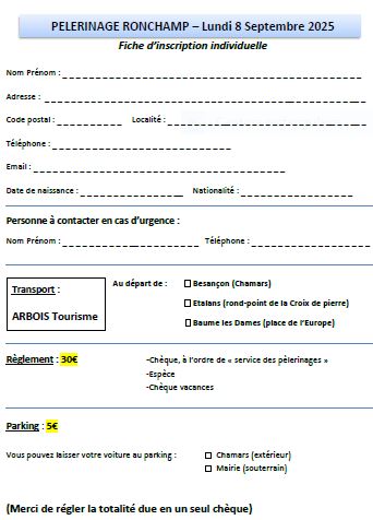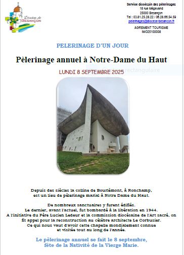 Le pèlerinage annuel à Ronchamp aura lieu le lundi 8 septembre, jour de la nativité de la vierge Marie, en présence de Monseigneur BOUILLERET. Le transfert en bus est organisé depuis Etalans - Besançon - Baume les Dames.
