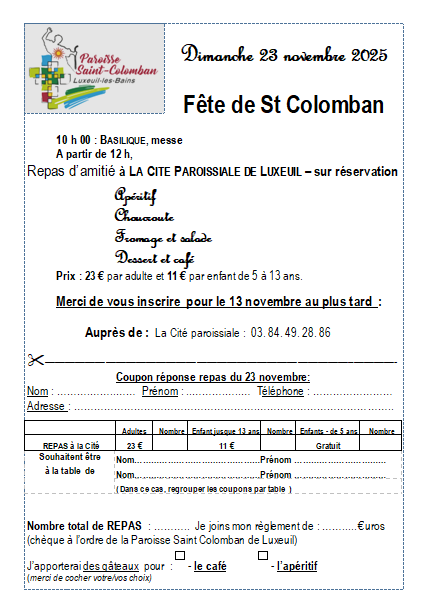 Un repas convivial vous attend ensuite, à la cité paroissiale. Venez nombreux partager ce moment de fête et de fraternité et réservez dès à présent votre repas !