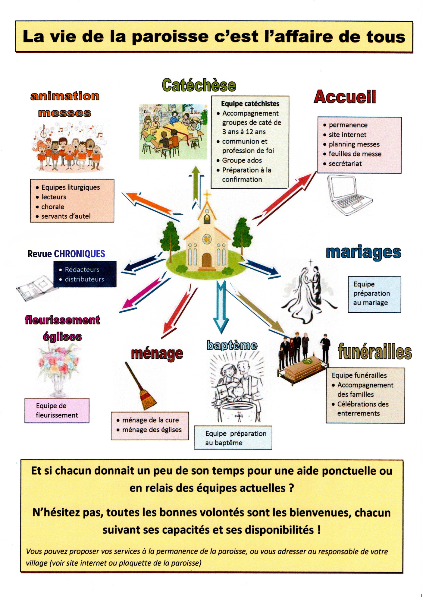 Tous les bénévoles de nos paroisses ont, parfois depuis de longues années, revêtu l'habit du service pour assurer diverses tâches de ménage, de sacristie, de secrétariat, de notariat, de gestion, d’accueil, d’écoute, de catéchèse, d’accompagnement aux sacrements…. Que tous soient vivement remerciés et qu’ils trouvent dans ces services épanouissement personnel et croissance spirituelle.