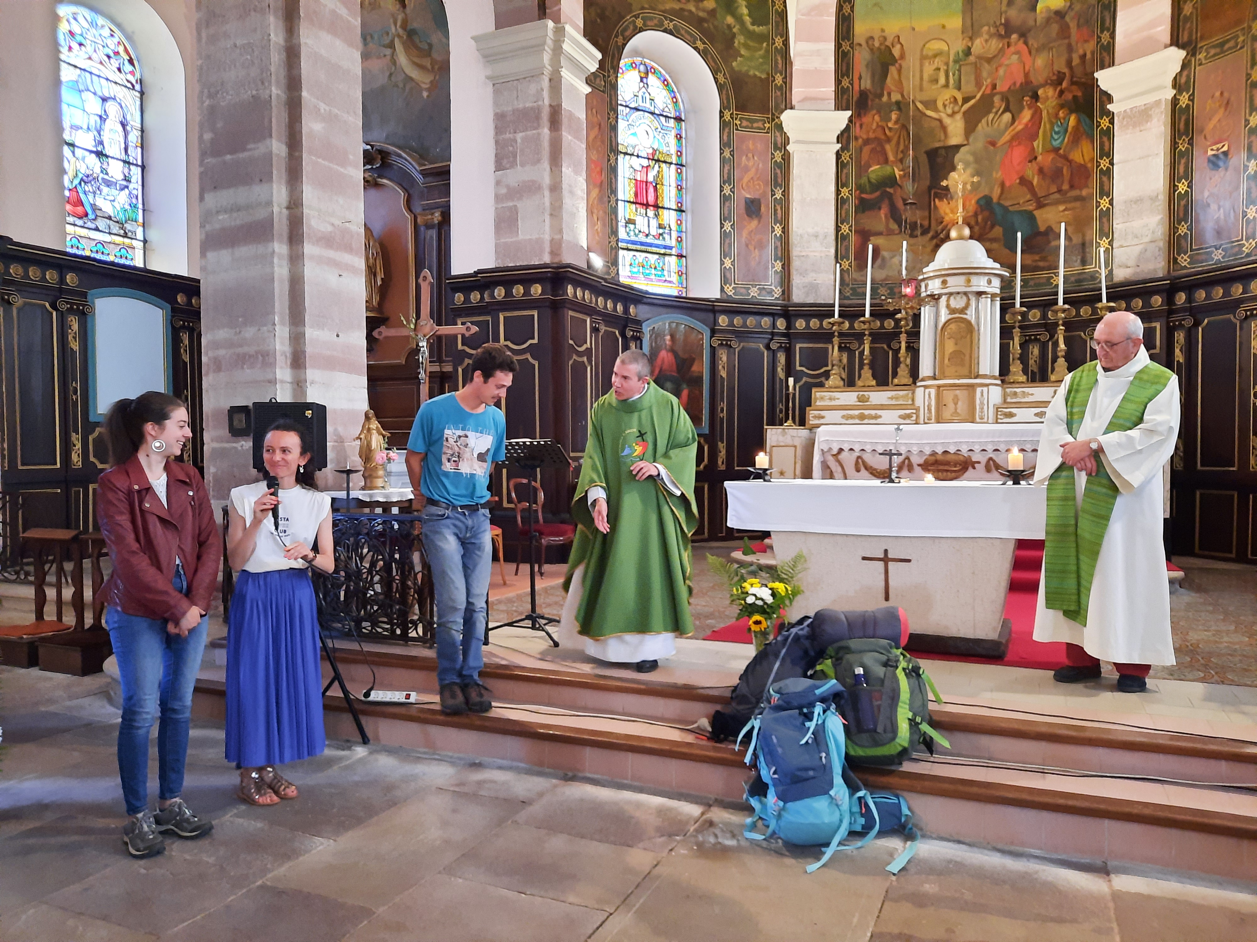 Le 13 juillet au cours de la messe à Baudoncourt, le Père Jean-François a béni les sacs de quatre jeunes de notre doyenné. Apolline, Sophie, Charlotte et Thibault ont pris un temps avec le Seigneur pour lui confier le jubilé des jeunes qu'ils s'apprêtent à vivre à Rome.