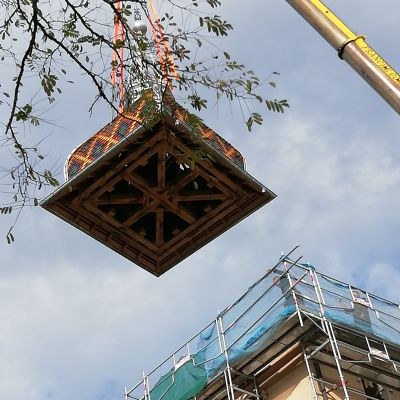 - 8 octobre 2022 : Mise en place du clocher rénové sur le beffroi de l'église