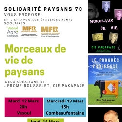 Solidarité Paysans Haute-Saône a le plaisir de vous convier au spectacle Morceaux de vie des Paysans de la Cie Pakapaze avec Jérôme Rousselet pour les deux créations : Morceaux de vie et Le Progrès Progresse ; qui se dérouleront :