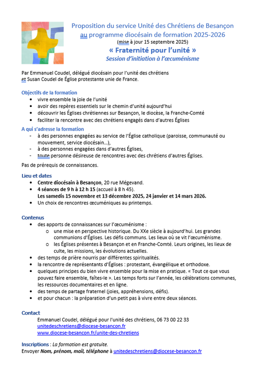 Le service diocésain de l'Unité des Chrétiens reconduira dès novembre 2025 sa session d'initiation à l’œcuménisme. Découvrez les objectifs et le programme de cette formation gratuite et ouverte à tous.
