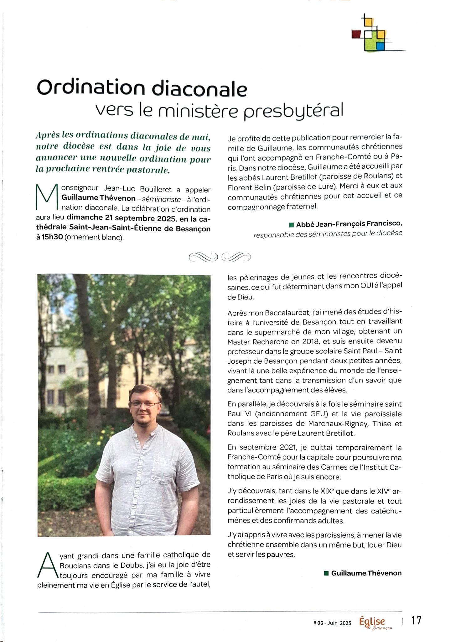 Originaire de Bouclans dans le Doubs, Guillaume Thévenon suit sa formation au séminaire des Carmes à Paris, et a été appelé au diaconat en vue du ministère presbytéral par Monseigneur Jean-Luc Bouilleret.