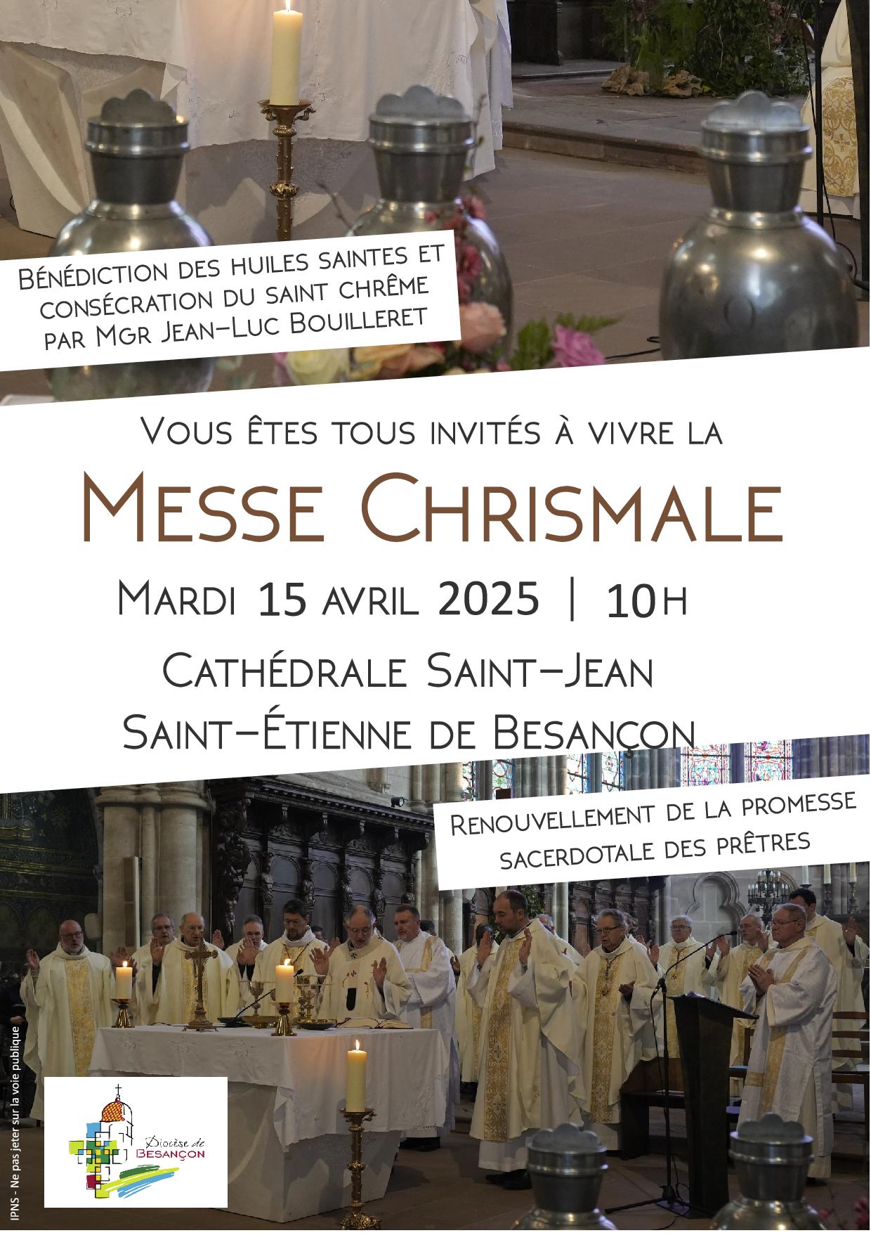 Publié le 08/04/2025Mgr Jean-Luc Bouilleret présidera cette messe durant laquelle il bénira les huiles saintes et consacrera le saint Chrême. Au cours de cette messe qui manifeste l’unité de toute l’Église diocésaine autour de son évêque, les prêtres renouvellent leurs promesses sacerdotales :
